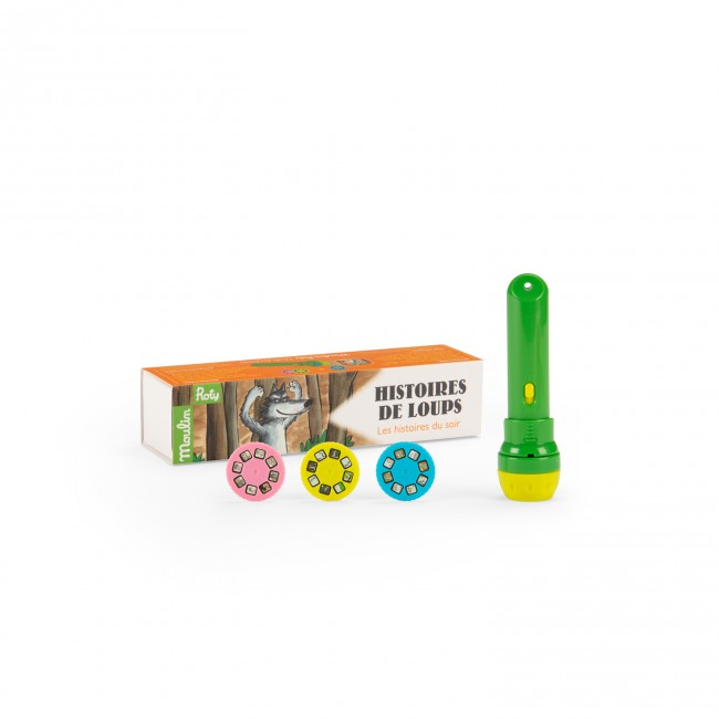 Découvrez la Lampe à histoires Loup de Moulin Roty, une collaboration avec l'École des Loisirs. Projetez 3 histoires captivantes du célèbre Loup de Mario Ramos pour émerveiller les enfants dès 4 ans.