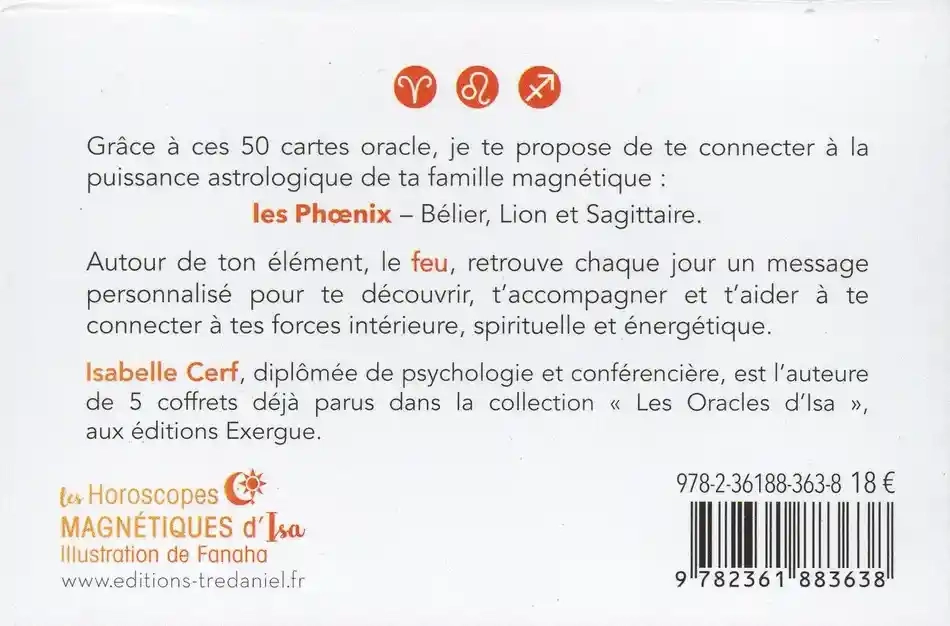 Grâce à ces 50 cartes oracle, je te propose de te connecter à la puissance astrologique de ta famille magnétique : les Phoenix ? Bélier, Lion, Sagittaire. Autour de ton élément, le Feu, retrouve chaque jour un message personnalisé pour te découvrir, t'accompagner et t'aider à te connecter à ta force intérieure, ta force spirituelle et ta force énergétique.