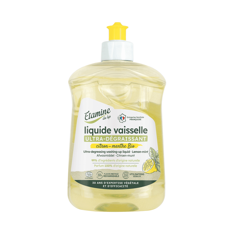 Le Liquide Vaisselle Citron-Menthe Etamine du lys nettoie parfaitement la vaisselle tout en respectant votre peau.