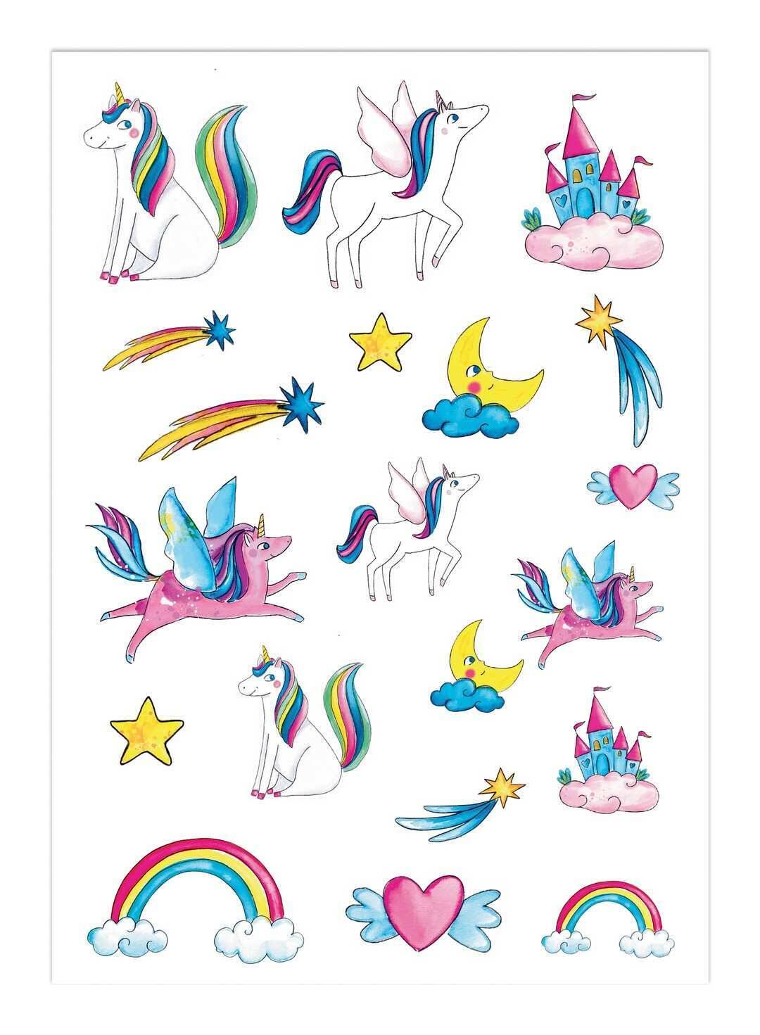 Planche de 20 tatouages éphémères sur le thème des licornes, dessinés à l'aquarelle par une artiste française. Idéale pour les enfants dès 3 ans, cette planche de 14,8 cm x 21 cm est parfaite pour les fêtes et anniversaires.