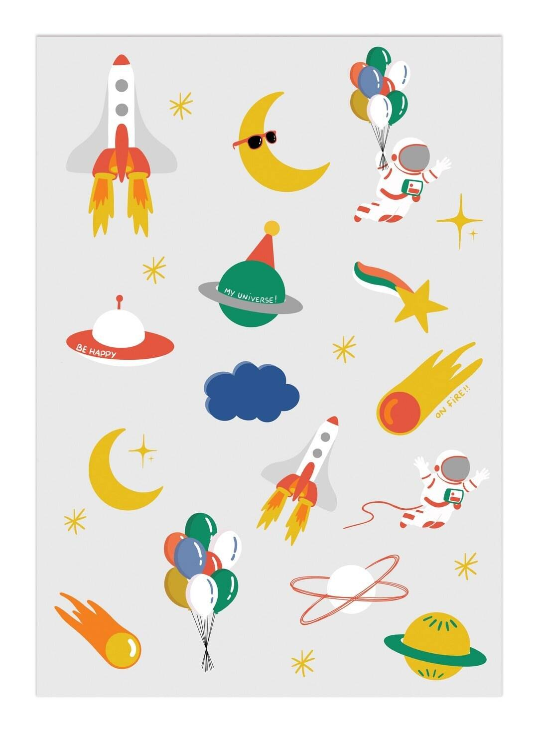 Explorez l'univers avec les tatouages temporaires 'Tattoo Mania Espace' d'Avenue Mandarine. 16 motifs spatiaux captivants, faciles à appliquer et sûrs pour les enfants dès 5 ans.