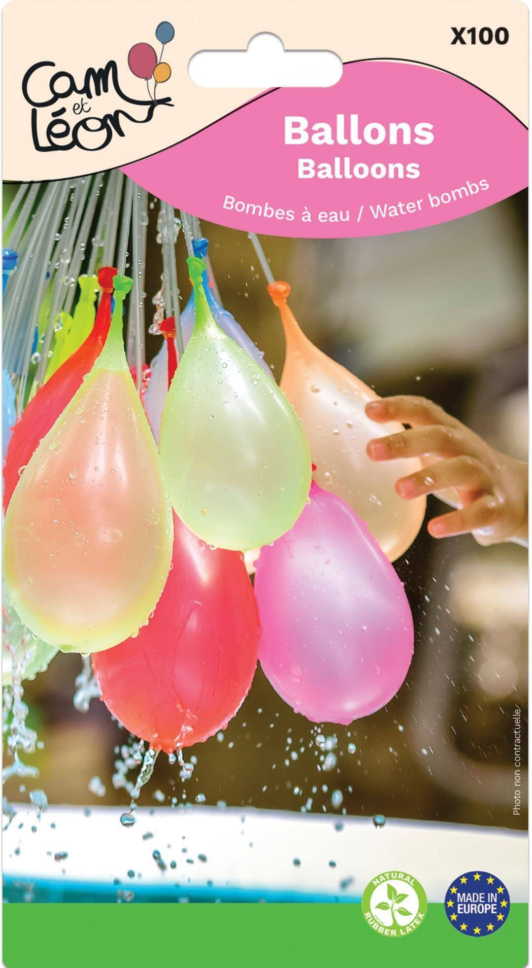 Lot de 100 ballons bombes à eau multicolores en latex naturel, faciles à remplir et à fermer automatiquement. Idéaux pour des jeux d'eau en extérieur dès 3 ans.