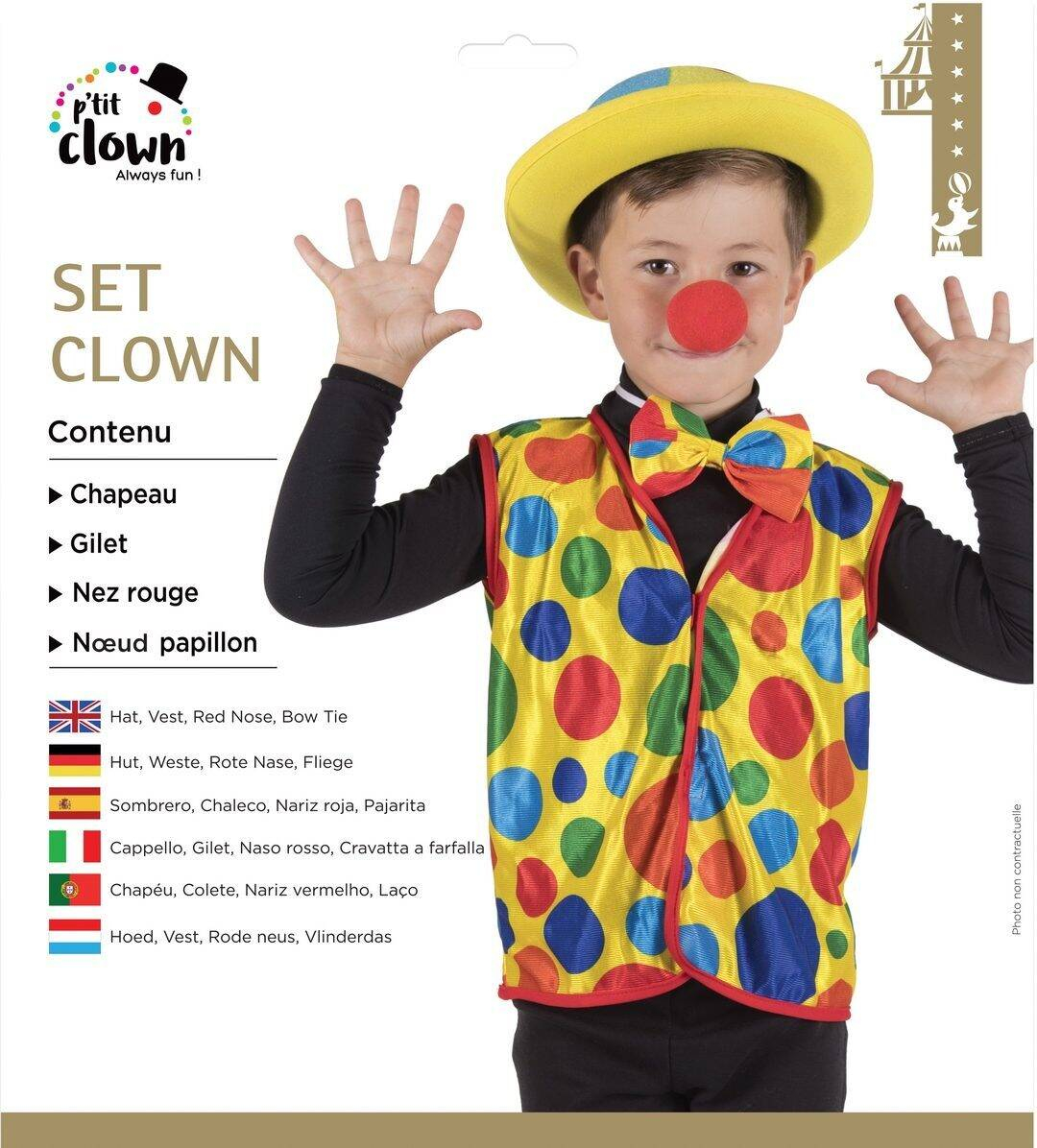 Transformez votre enfant en un clown joyeux avec le set de déguisement P'tit Clown, comprenant un chapeau, un gilet, un nœud papillon et un nez rouge, idéal pour les fêtes costumées.