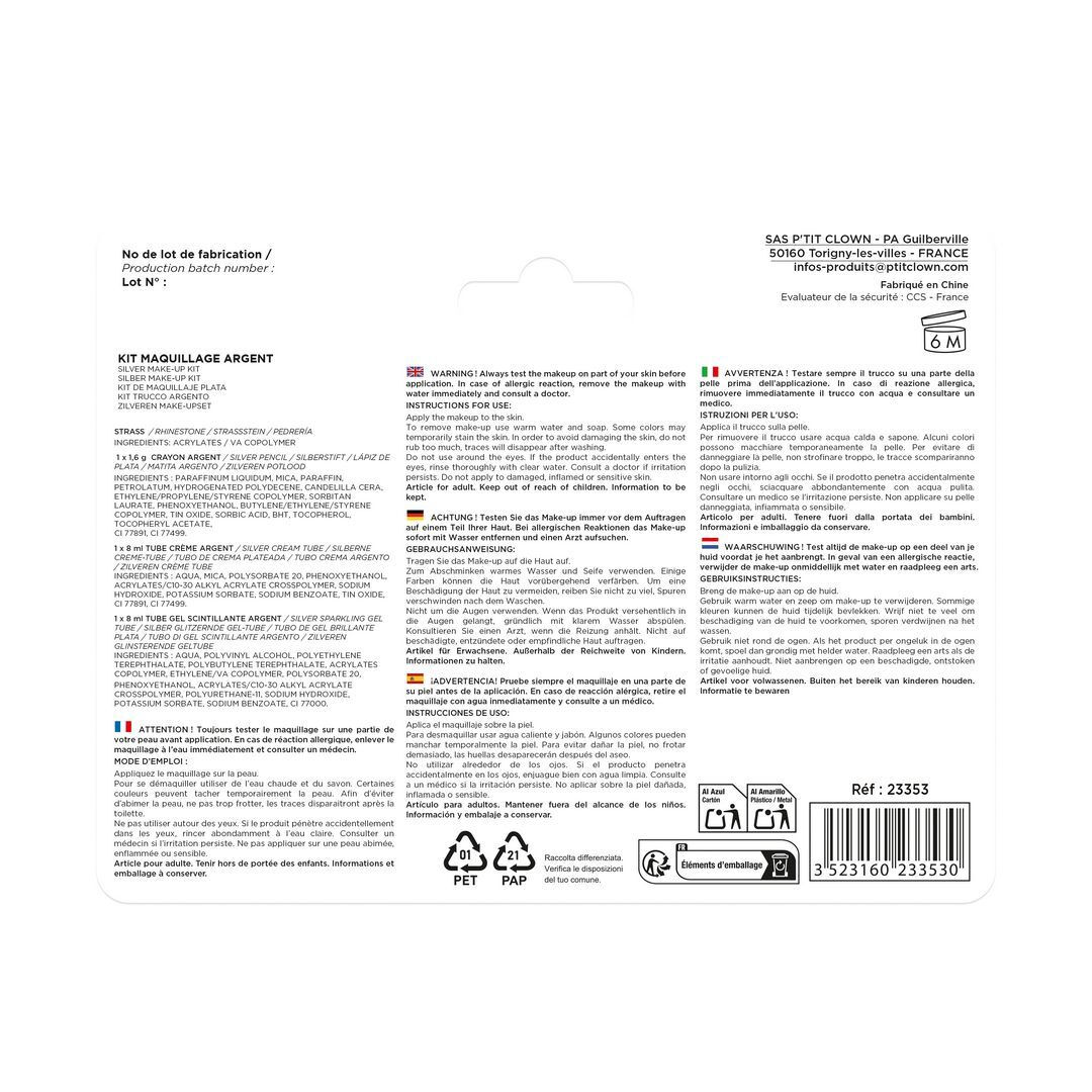 Transformez votre apparence avec le Kit Maquillage Argent de P'tit Clown, idéal pour ajouter une touche d'éclat à vos déguisements et événements festifs.