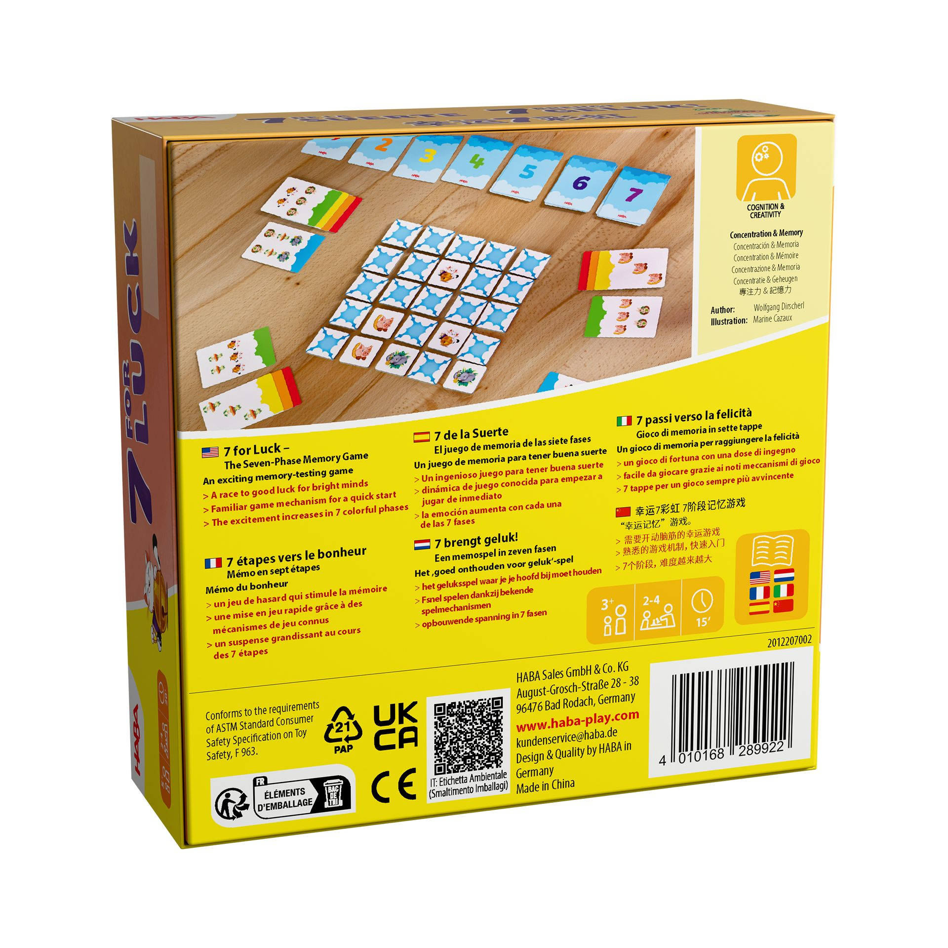 7 pour la chance de HABA est un jeu de mémoire coloré pour 2 à 4 joueurs dès 5 ans. Les joueurs accomplissent sept missions en retrouvant des animaux porte-bonheur cachés, ajoutant à chaque succès une nouvelle couleur à leur arc-en-ciel. Ce jeu stimule la mémoire, la concentration et la logique, avec des parties d'environ 20 minutes. Les règles simples et les illustrations joyeuses en font un choix idéal pour les familles et les jeunes enfants.