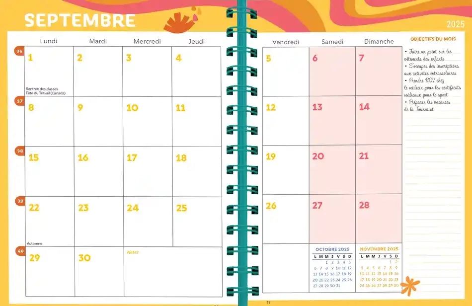 L'Agenda familial Mémoniak 2025-2026 des Éditions 365 Nesk est conçu pour faciliter l'organisation de la vie de famille sur 16 mois, avec des fonctionnalités pratiques telles que des listes de courses détachables, des autocollants et des pages d'informations utiles.