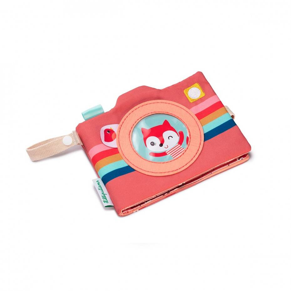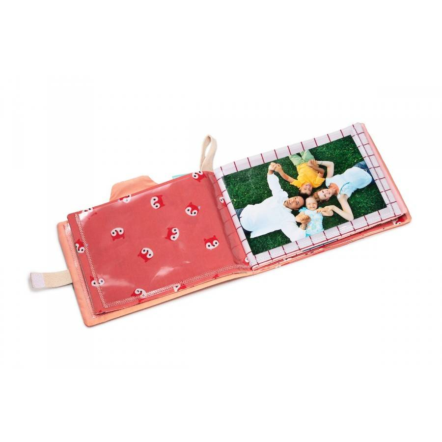 Album photo en tissu Alice la renarde de Lilliputiens, idéal pour les enfants dès 9 mois. Contient 10 pochettes pour photos 10 x 15 cm et une couverture personnalisable. Facile à transporter grâce à sa sangle avec pression.