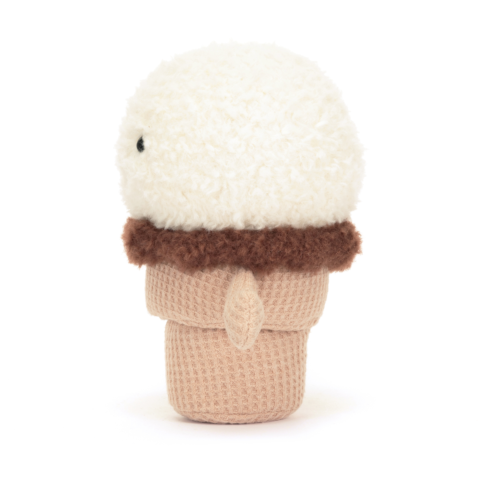 Amuseables Ice Cream Cone est une douce boule de joie en fourrure crème texturée. Nichée dans un petit cornet gaufré beige aux bras larges, cette cuillère souriante repose sur un bord de chocolat moelleux pour une gâterie sucrée qui continue de donner.