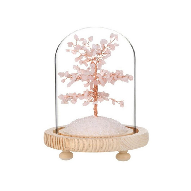 Finement orné de pierres naturelles de quartz rose, cet arbre du bonheur saura s'intégrer harmonieusement dans un intérieur grâce à son design équilibré et sa mise en beauté sous une cloche en verre. L'arbre du bonheur est le symbole de la vie, du lien entre la terre et l'infini céleste. Le quartz rose permet d'apaiser les peines et de développer sa confiance et son ouverture à l'autre. Sélectionné pour ses vertus apaisantes, il symbolise l'amour de soi et des autres.