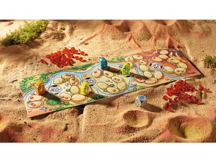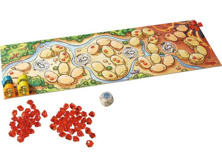 Contenu : 1plateau de jeu, 1dragon vert «Croc-Tonnerre», 1dragon jaune «Pluie-Détincelle», 1dragon orange «Feu-follet», 1dragon turquoise «Foudre-Argentée», 4tuiles de tourbillon, 1dé à tourbillons, 60pierres volcaniques, 1règle du jeu.