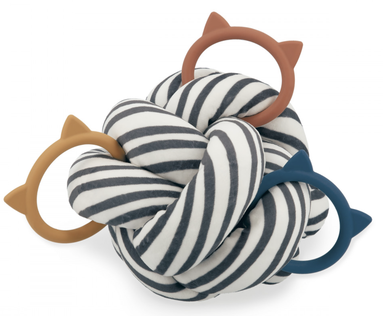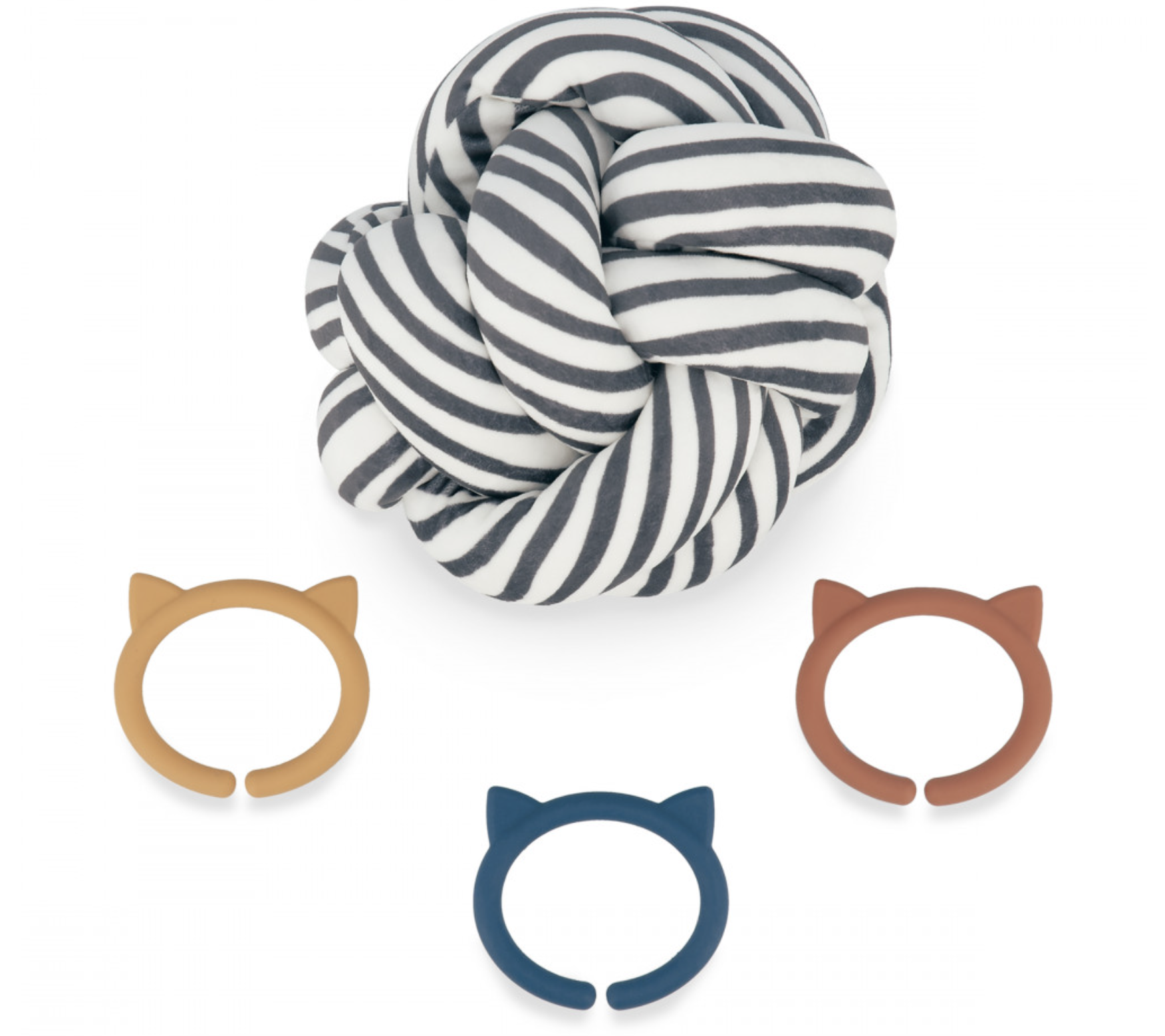 Stimulez les sens de votre bébé avec la Balle d'éveil sensoriel Kaloo, dotée d'une forme en nœuds entrelacés, de motifs contrastés et de trois anneaux en silicone amovibles, parfaits pour la préhension et la dentition.
