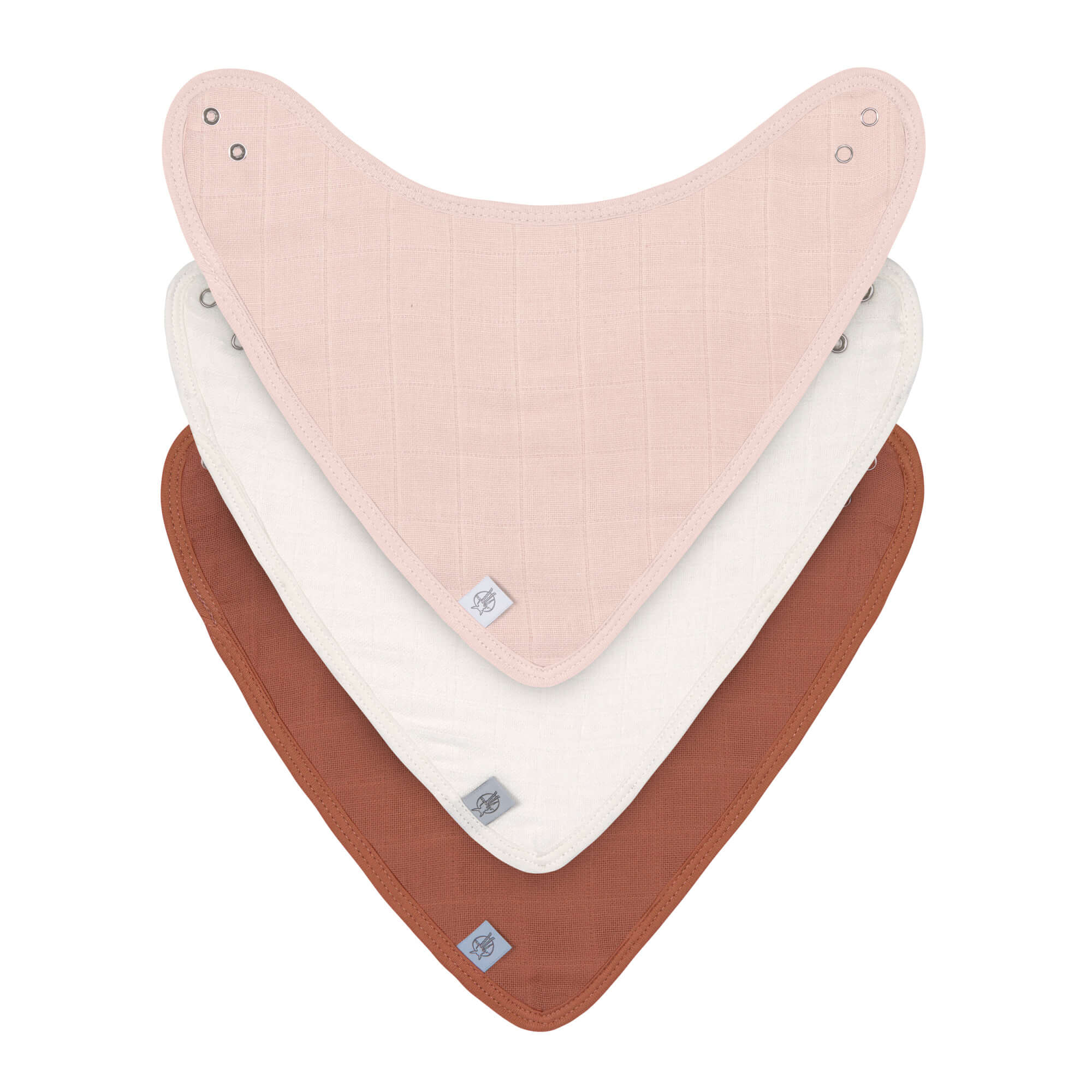 Lot de 3 bavoirs bandanas Lassig en mousseline, coloris Powder Pink, Milky et Rust. Doux, respirants et ajustables, idéaux pour les bébés de 6 à 24 mois.