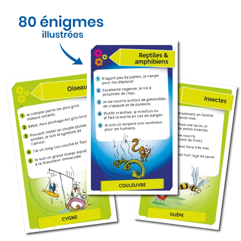 Enigmes - Monde Animal est un jeu éducatif pour enfants dès 7 ans, combinant réflexion et adresse pour deviner 80 animaux à travers des indices amusants. Fabriqué en France de manière éco-responsable, il est idéal pour développer les capacités d'observation et de déduction tout en s'amusant.