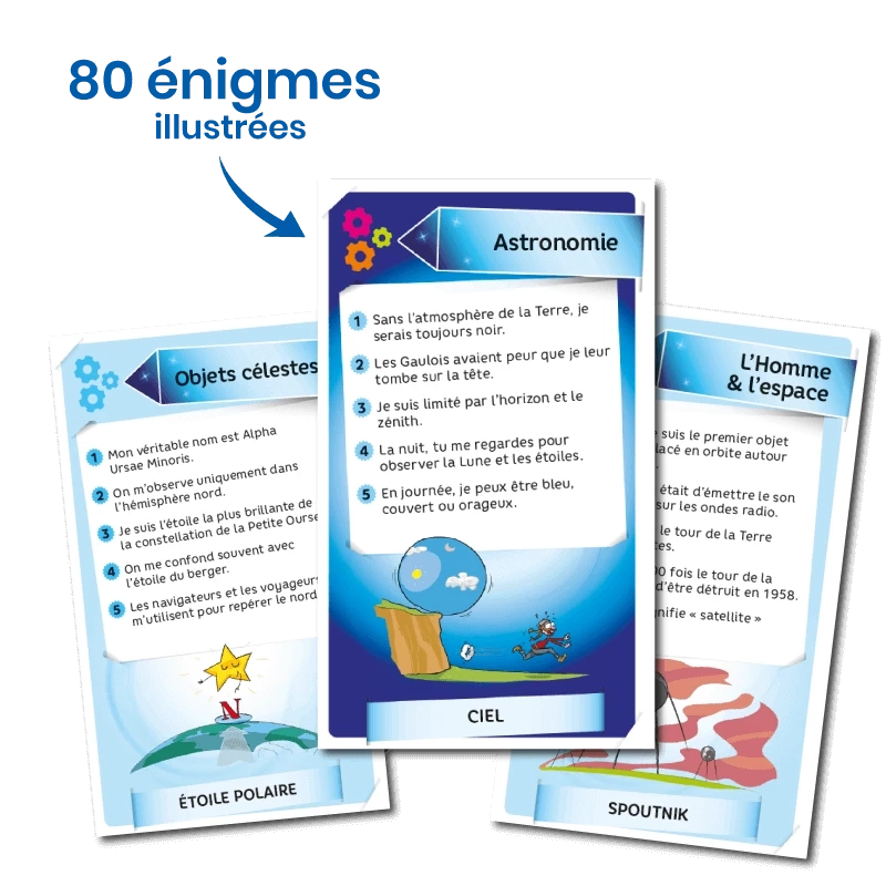 Enigmes - Espace de Bioviva est un jeu éducatif et éco-responsable pour 2 à 6 joueurs dès 7 ans. Devinez des objets célestes à travers 80 énigmes illustrées et testez votre adresse pour remporter la partie. Fabriqué en France avec des matériaux durables.