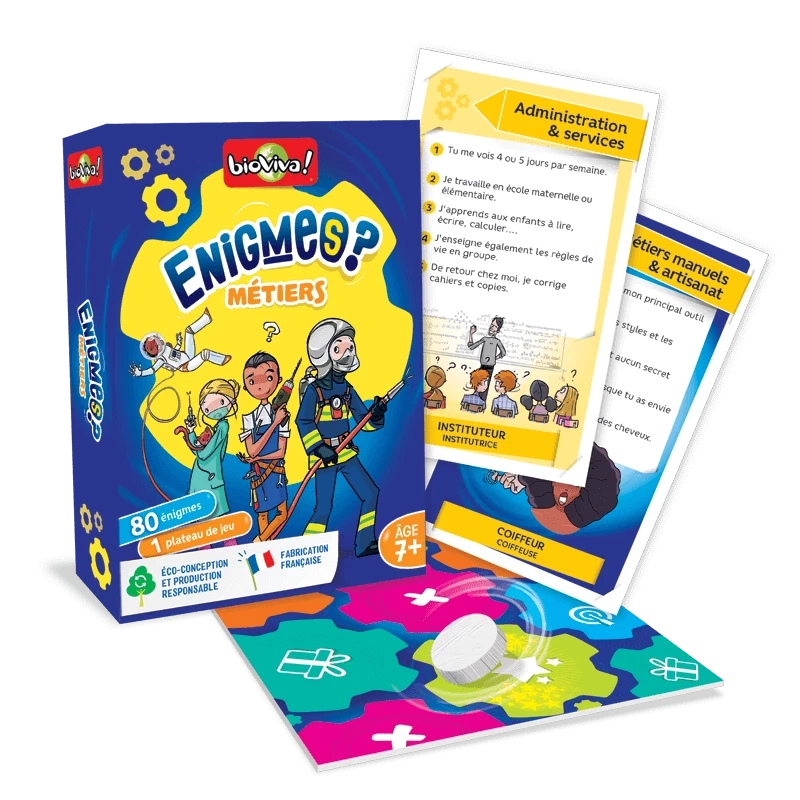 Faites preuve d’adresse en lançant le jeton sur le plateau pour tenter de gagner plus de cartes Enigmes - Métiers !