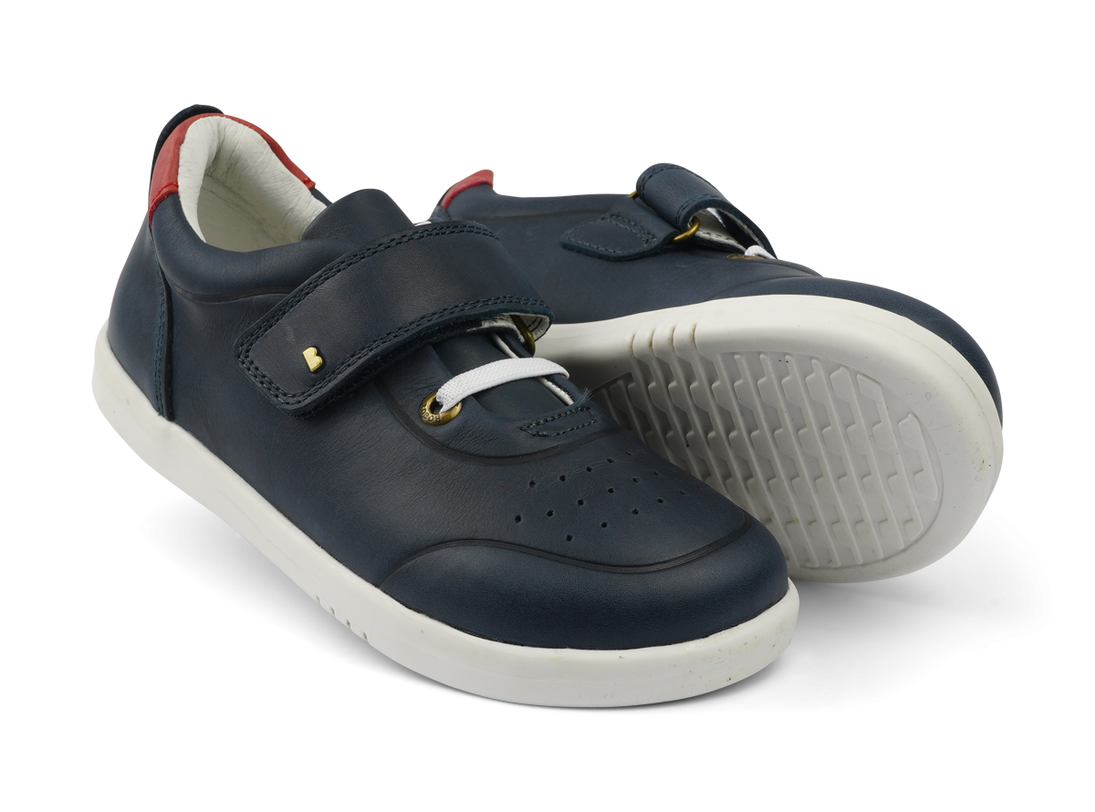 Les chaussures Bobux Kid+ Ryder Trainer Navy + Red combinent style rétro et confort, avec une fabrication en cuir premium, une semelle flexible et des fermetures velcro pratiques.