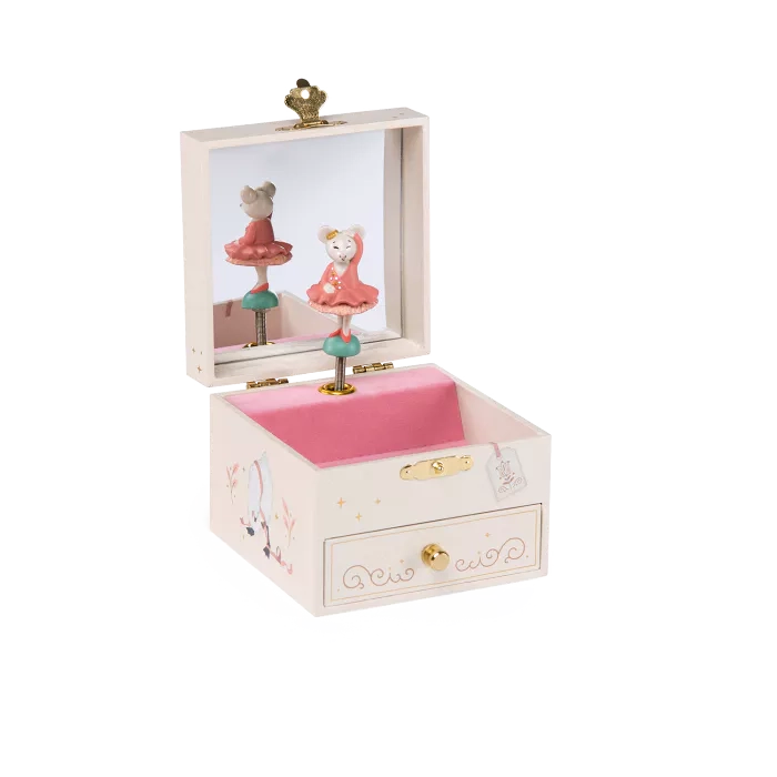 Découvrez la boîte à musique coffret 'La petite école de danse' de Moulin Roty, un véritable écrin de poésie pour les enfants dès 3 ans. Ce coffret illustré est doté d'un compartiment principal et d'un petit tiroir latéral, parfaits pour ranger bijoux et autres trésors précieux. En ouvrant le couvercle, une ravissante petite souris danseuse se met à virevolter au son d'une douce mélodie, offrant un spectacle enchanteur. Un miroir intégré permet à l'enfant de s'admirer, ajoutant une touche de magie à l'ensemble.