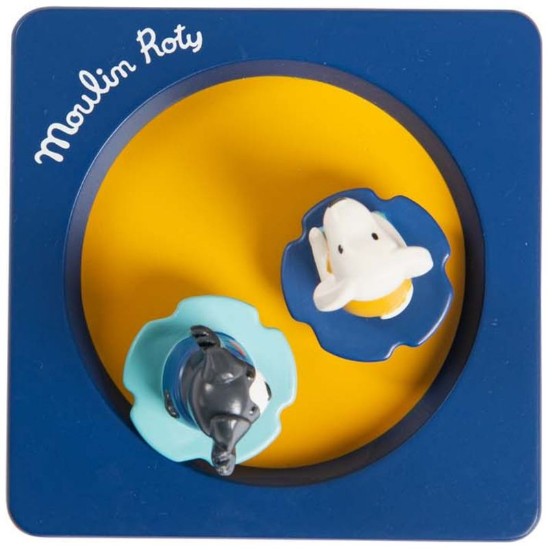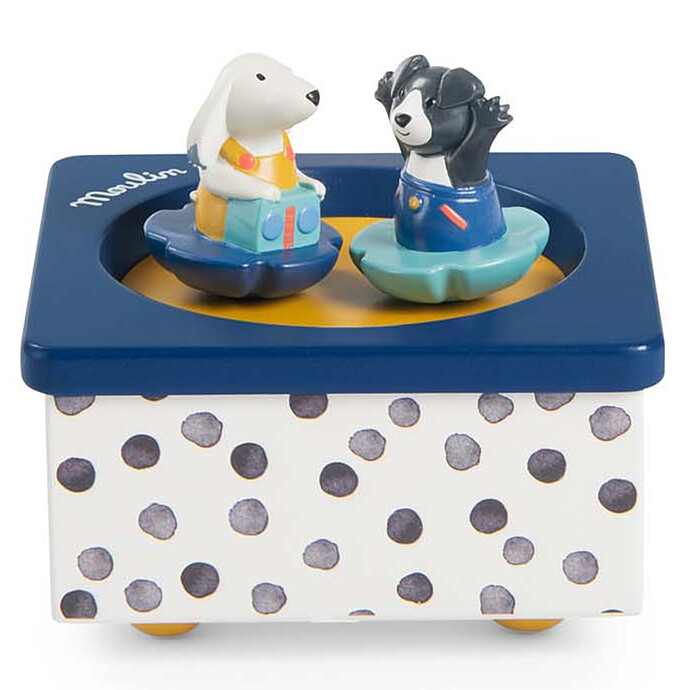 La boîte à musique Puce & Pilou de Moulin Roty est un objet décoratif en bois peint, où les personnages Puce et Pilou dansent sur la mélodie 'Un week-end à Rome' d'Étienne Daho, créant une ambiance apaisante pour bercer votre bébé.
