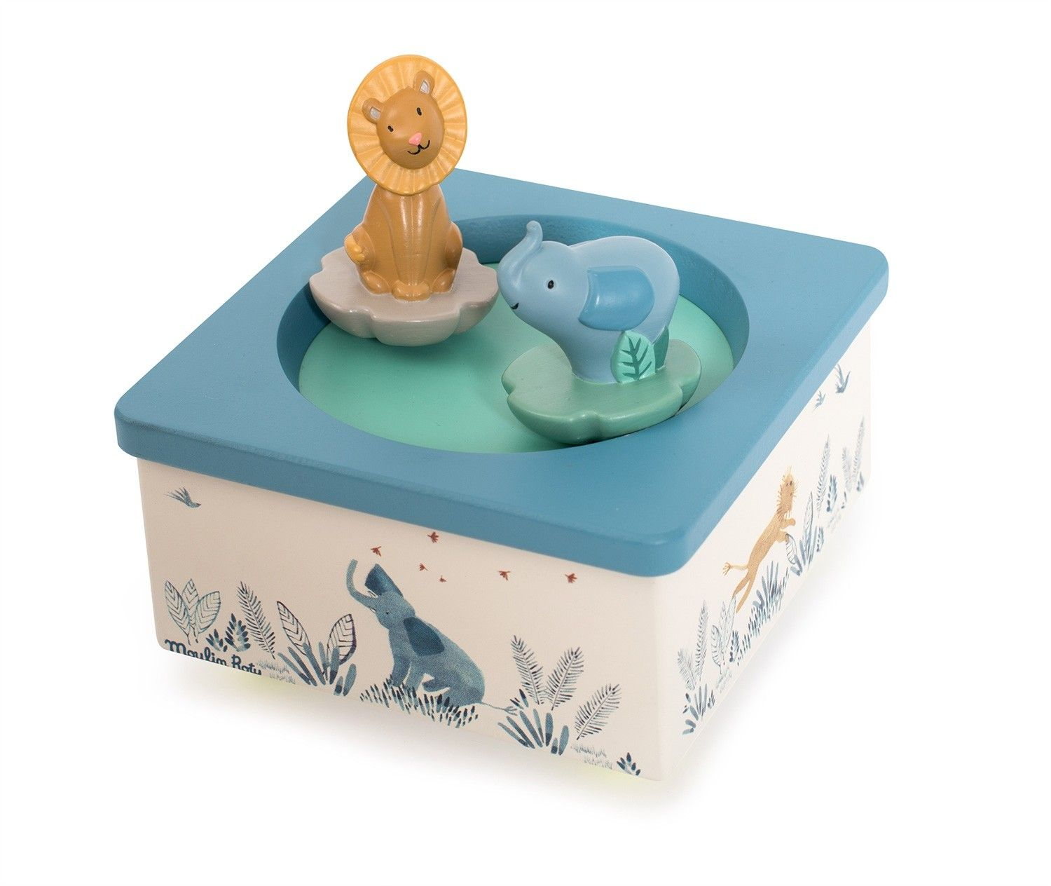 La boîte à musique 'Sous mon baobab' de Moulin Roty est un objet délicat conçu pour apaiser et émerveiller votre enfant. Avec ses illustrations aquarellées représentant un lion et un éléphant dansant au milieu de la savane, elle diffuse une douce mélodie pour accompagner bébé vers le sommeil.