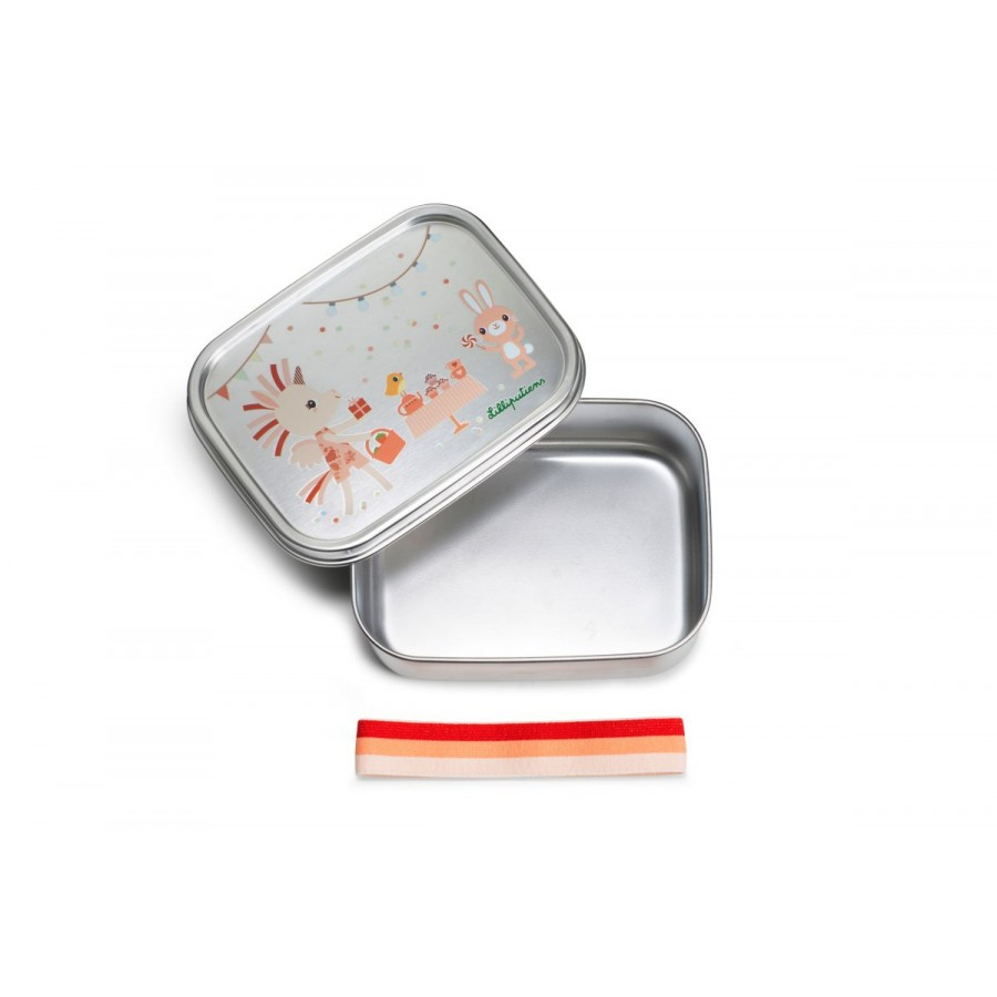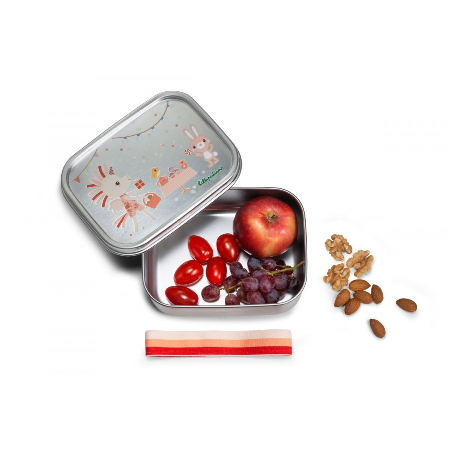 La Boîte à tartines Happy Lena de Lilliputiens est une lunch box en acier inoxydable de 1,5 L, sécurisée par un couvercle et un élastique, idéale pour les repas de votre enfant à l'école ou en sortie.