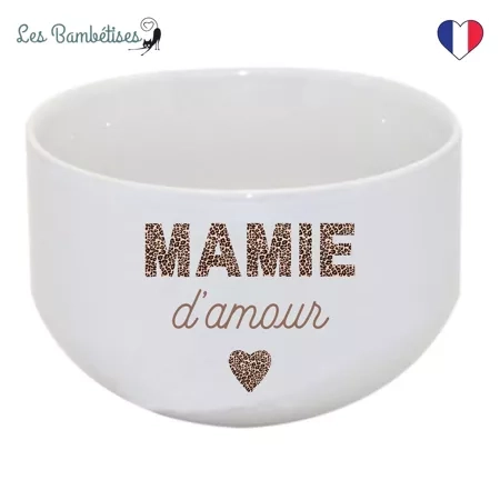 Le Bol Mamie d'Amour de Les Bambetises est un élégant bol en céramique blanche, orné d'un motif léopard et de l'inscription "MAMIE d'amour". Idéal pour offrir lors de la fête des grands-mères, d'un anniversaire ou de Noël, ce bol allie praticité et style pour accompagner votre mamie au quotidien.