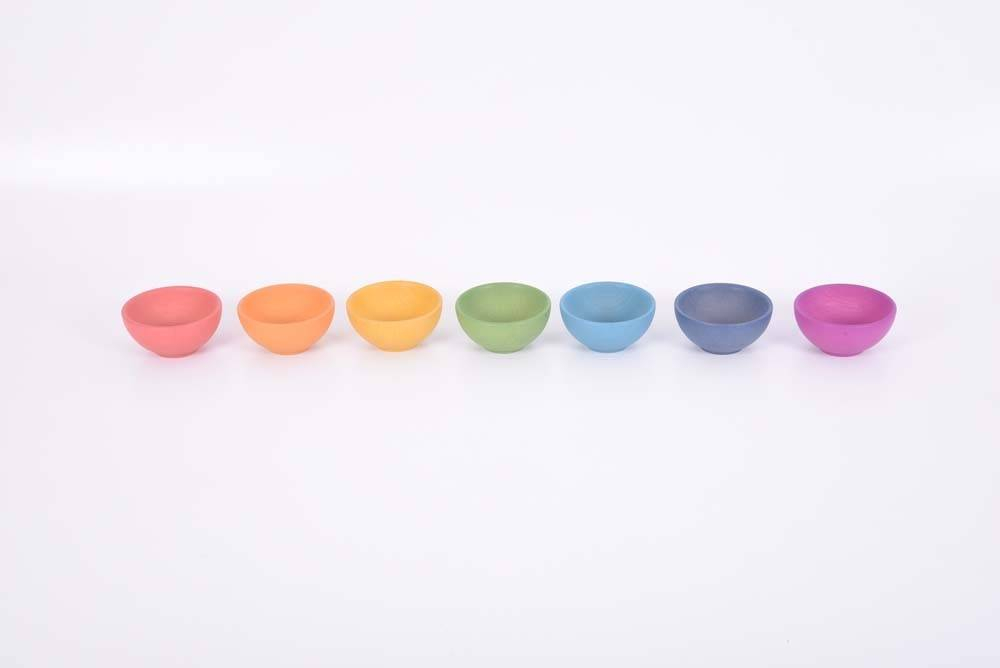 Cet ensemble contient de simples bols en bois dans chacune des 7 couleurs de l'arc-en-ciel. Idéal pour les premières activités d'empilement, pour le tri ou la correspondance des couleurs, pour améliorer les scènes de jeu du petit monde ou pour stocker de petits trésors.