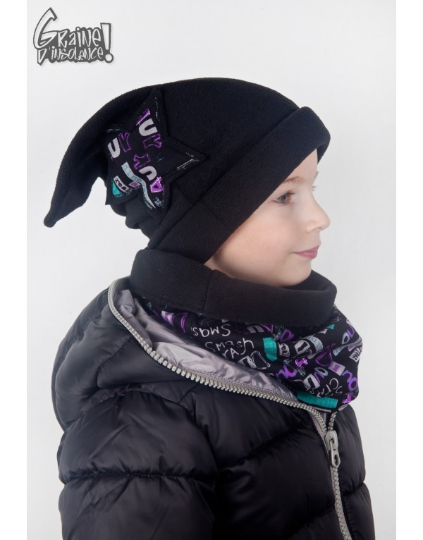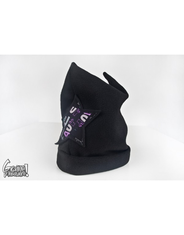 Bonnet en polar noir décoré d'une étoile en polar surmonté d'une autre en coton imprimé.