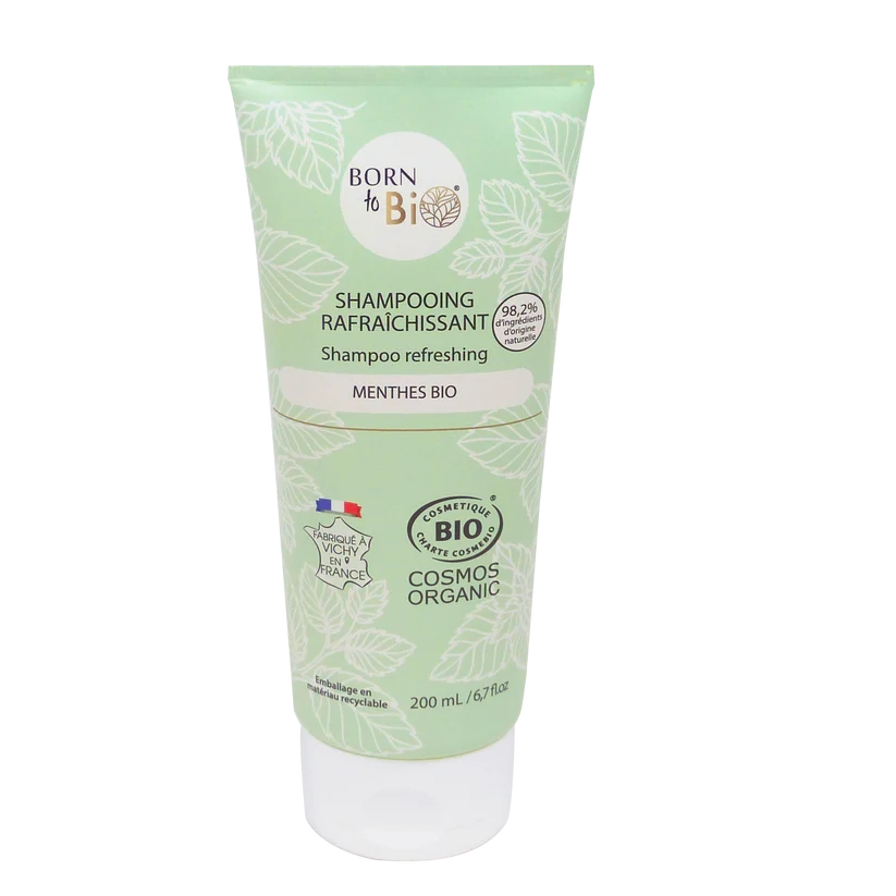 Adoptez le Shampooing Rafraîchissant Menthe Verte Bio de Born to Bio pour des cheveux propres, légers et délicieusement parfumés.