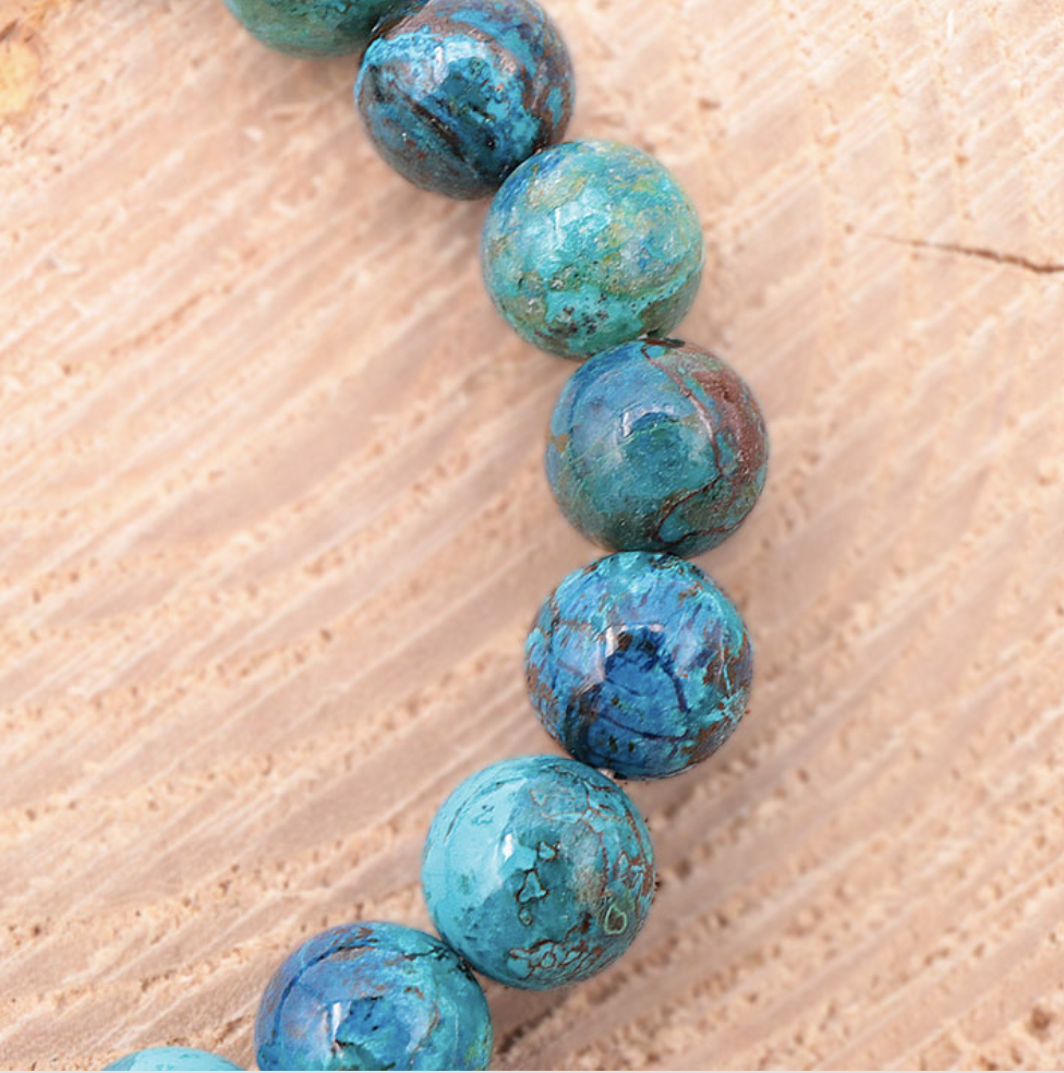 Son énergie très douce et harmonisante est due à deux facteurs principaux : sa formation sédimentaire et un taux élevé de cuivre (34 %). La Chrysocolle est la pierre idéale pour apporter paix et harmonie, aussi bien au corps qu’à l’esprit. Elle favorise considérablement notre capacité à vivre en harmonie avec nous-mêmes, avec les autres, et avec notre environnement naturel. Pour nous-mêmes, elle développe patience et estime de soi, aidant à réduire considérablement les sentiments de culpabilité. Elle apaise les émotions fortes et les conflits internes.