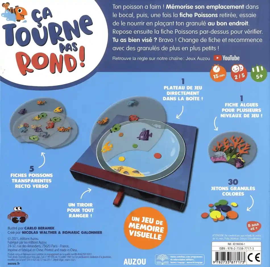 Ça tourne pas rond ! est un jeu de mémoire visuelle pour enfants dès 5 ans. Mémorisez l'emplacement de votre poisson et nourrissez-le avec précision pour remporter la partie. Un jeu ludique et éducatif pour développer la concentration et la mémoire.