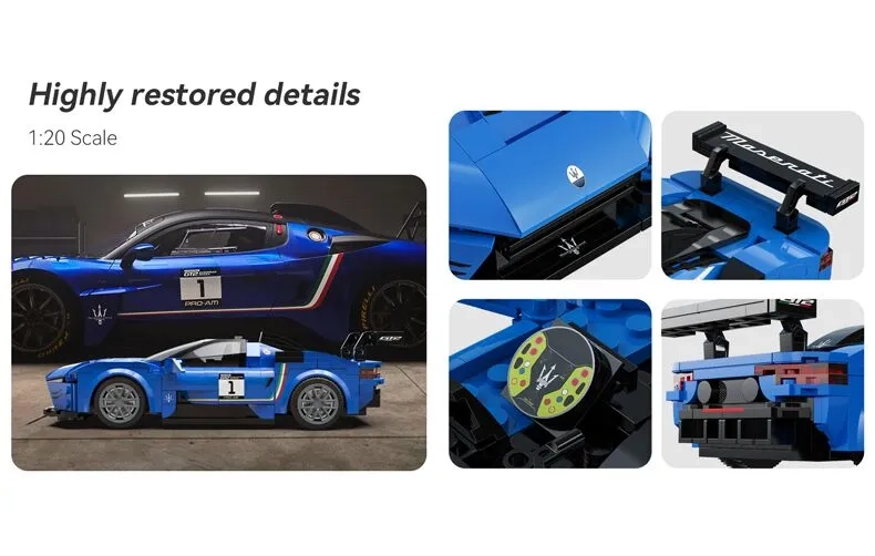 Assemblez la Maserati MC20 GT2 à l'échelle 1:20 avec ce kit de 320 pièces sous licence officielle. Compatible avec les briques LEGO, il offre un design authentique et un double mode de contrôle radiocommandé.