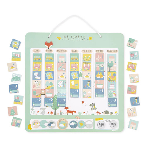Aidez votre enfant à organiser sa semaine avec le semainier magnétique Janod, comprenant 78 magnets d'activités, 7 magnets météo et 3 magnets personnalisables.