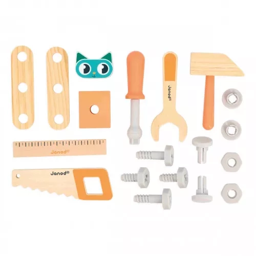 Faites place au jouet à tirer des petits bricoleurs ! Avec ce camion de bricolage à promener, les enfants dès 2 ans développent leur motricité fine et globale, tout en s'amusant ! Compagnon des premiers pas, ce jouet d'éveil en bois est équipé de roues en caoutchouc silencieuses. Véritable jeu de construction entre deux promenades, ce camion de bricolage est livré avec une multitude d'accessoires et d'outils ! Sont inclus : 5 outils (tournevis, clé, scie, règle et marteau), 4 pièces en bois, 10 accessoires de visserie en plastique. Les vis sont crantées pour toujours plus de réalisme et pour une meilleure manipulation par les petites mains des enfants. Enfoncer les clous, visser, mesurer ... Tant de manipulations idéales pour stimuler la dextérité des bambins et leur permettre d'imiter les grands avec leur jouet d'imitation bricolage ! L'autre atout de ce camion à promener, c'est sa benne qui bascule comme un vrai : livraison d'outils imminente ! Apprendre la marche avec un adorable jeu de construction, telle est la promesse de ce jouet premier âge à l'effigie d'un petit chat rigolo. Bébé se saisit de la ficelle, et c'est parti pour maîtriser l'art de la marche dans un univers en pleine construction ! Ce camion de chantier à tirer est composé de bois certifié FSC™, il fait partie de notre collection de jouets d'imitation bricolage : Brico'Kids.