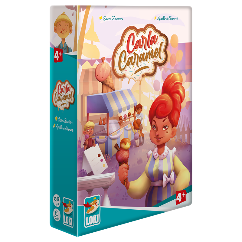 Carla Caramel est un jeu coopératif pour enfants dès 4 ans, où les joueurs aident une marchande de glaces à servir des cornets aux enfants avant que le soleil ne les fasse fondre.