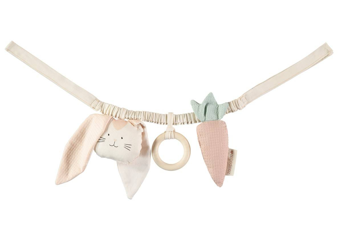 La chaîne d'activités Lapin de Nobodinoz est un jouet d'éveil en coton biologique, doté d'un lapin hochet, d'une carotte crépitante et d'un anneau de dentition en bois d'érable. Facile à attacher à la poussette, au transat ou au berceau, elle stimule les sens de bébé dès la naissance.