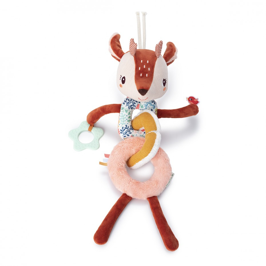 Les anneaux détachables favorisent la motricité fine, et la ficelle permet une fixation facile. Dimensions : 25 x 10 x 37 cm. Composition : Polyester et coton. Lavable en machine à 30°C.