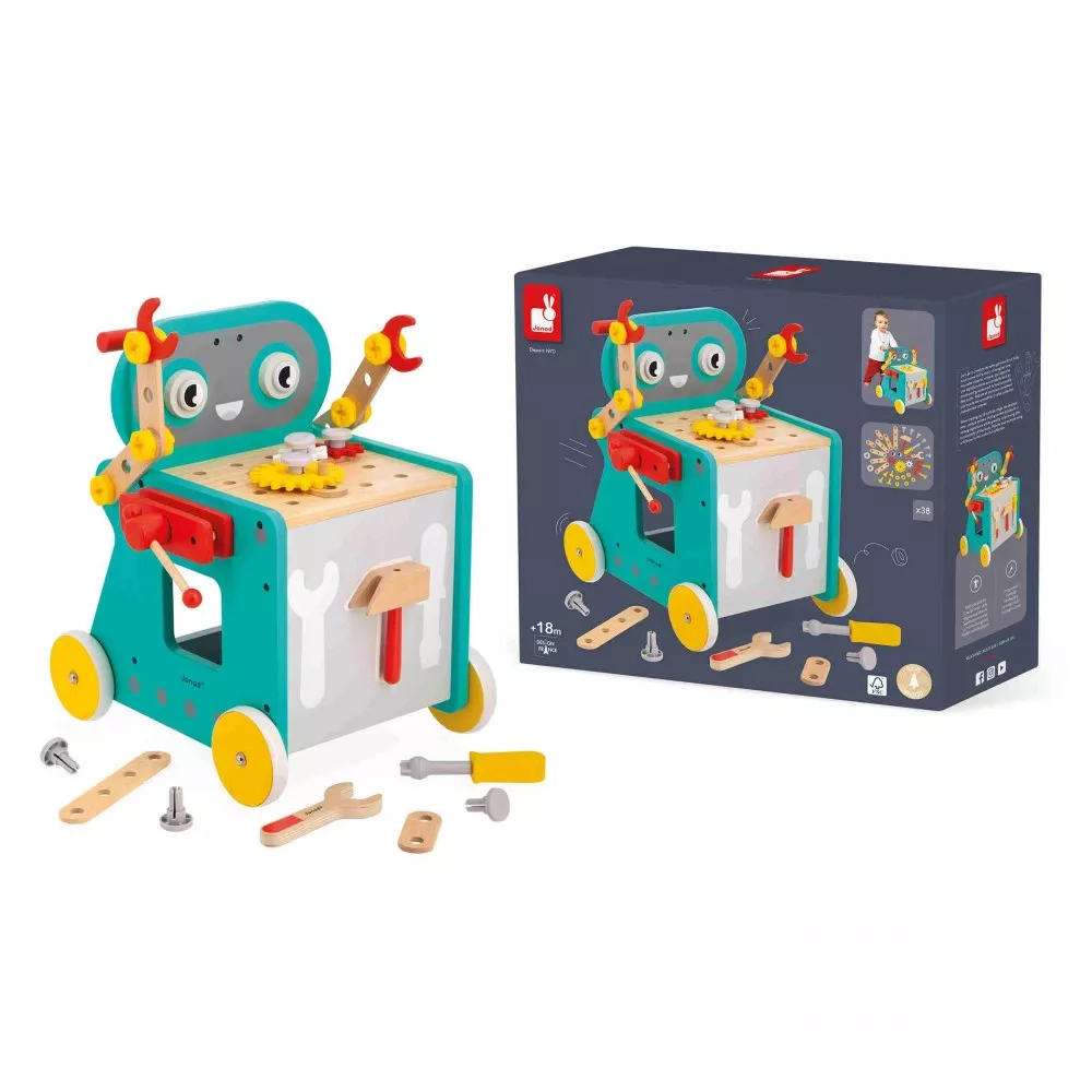Il développera sa motricité fine et sa créativité, tout en s'amusant ! Du rouge, du vert, du jaune et du bois naturel : ce chariot d'activités invite toute la famille au bricolage, dans l'univers des robots. Bébé vis, tourne, monte et descend, que de manipulations riches d'apprentissages !