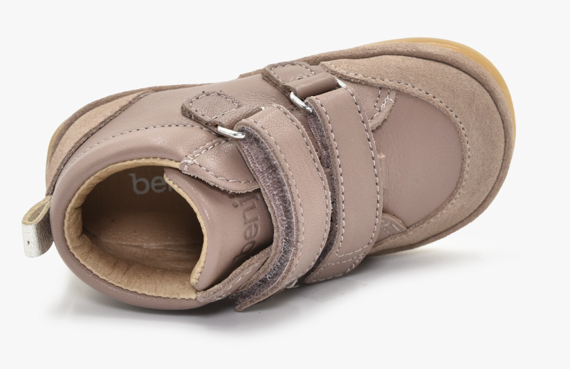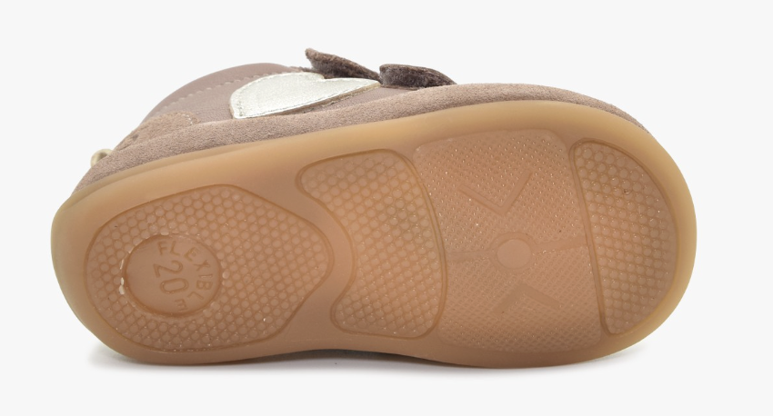 Les chaussures premiers pas Aubépine cœur de Benjie, en vieux rose et champagne, offrent confort et souplesse pour accompagner les premiers pas de votre enfant.