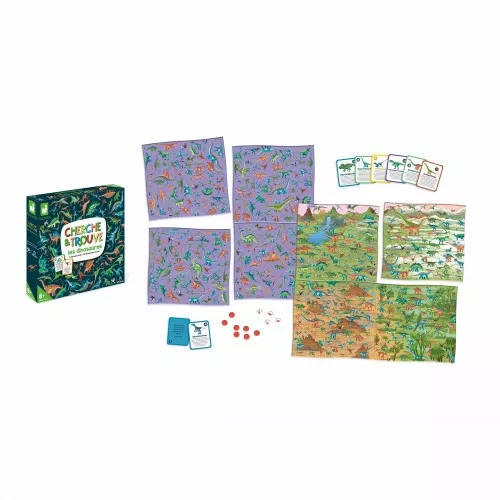 Partons à la recherche des plus beaux spécimens avec ce magnifique jeu de société Cherche et Trouve dinosaures. On commence par en apprendre plus sur les 60 différents dinosaures de ce jeu familial en répondant à une question, puis on part à la recherche de la réponse sur le plateau composé de 4 cartes en carton épais réversibles. Des fiches d'identité permettent d'apprendre beaucoup d'informations intéressantes sur les dinosaures avant de partir à leur recherche sur les plateaux de jeu. Amusez-vous avec 80 cartes devinettes !