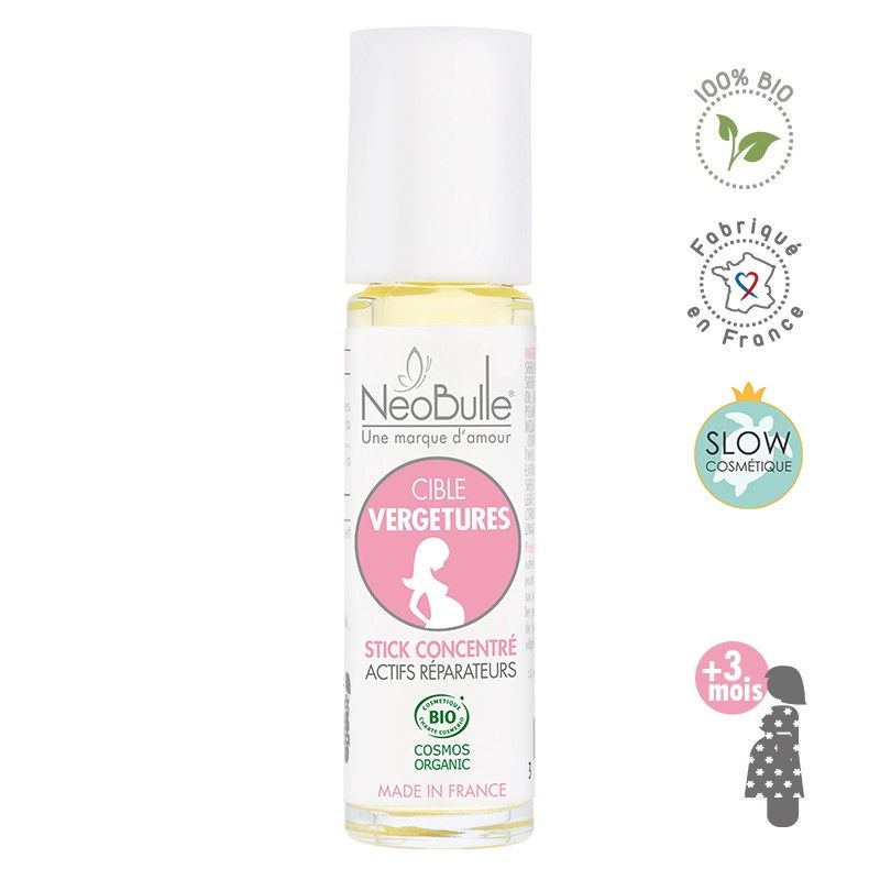 Soin ciblé d’urgence anti-vergeture. Action intense pour un soin ciblé. Formule 100% Bio à base de 6 actifs aux propriétés réparatrices.