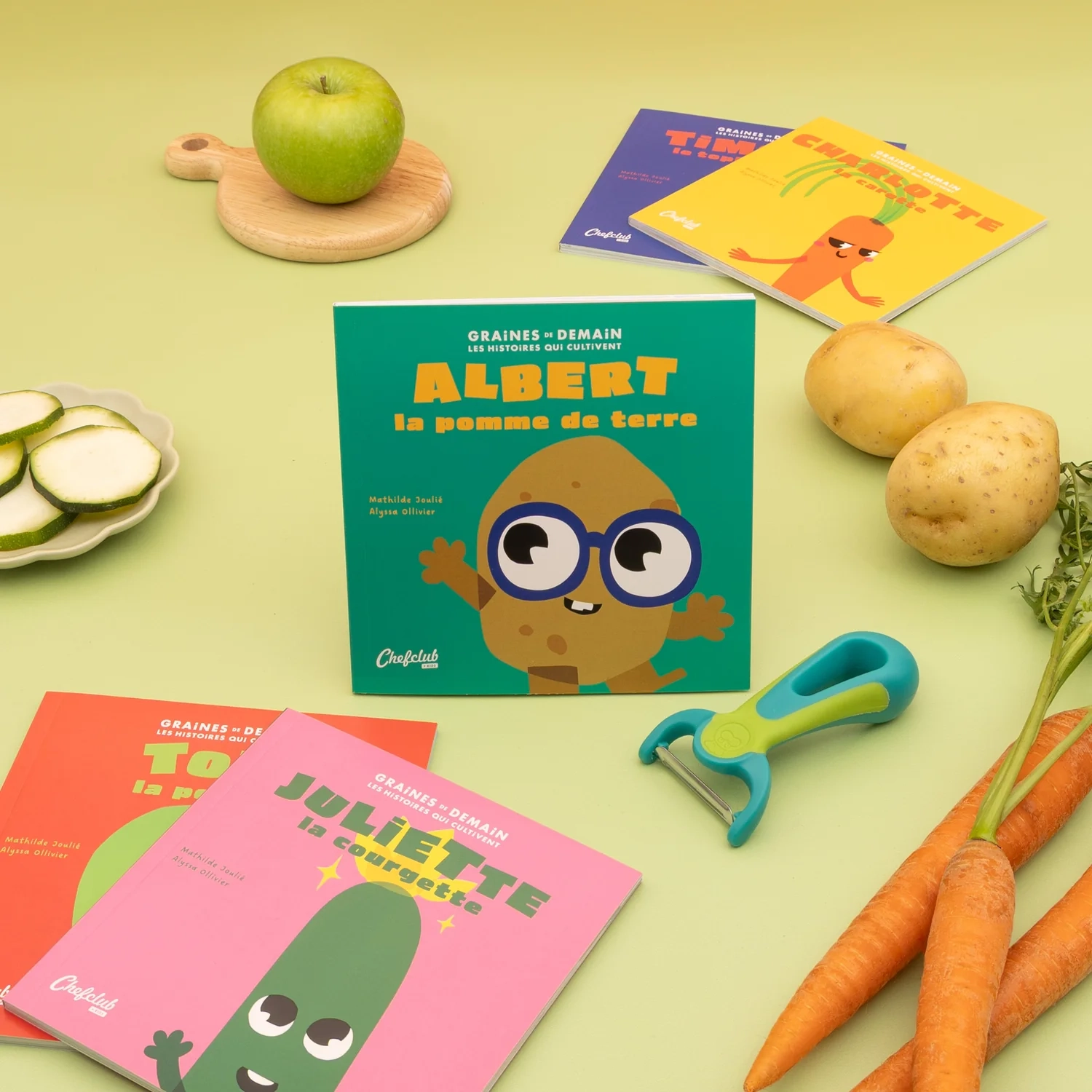 Le Coffret Graines de Demain et son éplucheur de Chefclub est une invitation ludique pour les enfants à découvrir le monde des fruits et légumes à travers des histoires captivantes et des activités culinaires adaptées.