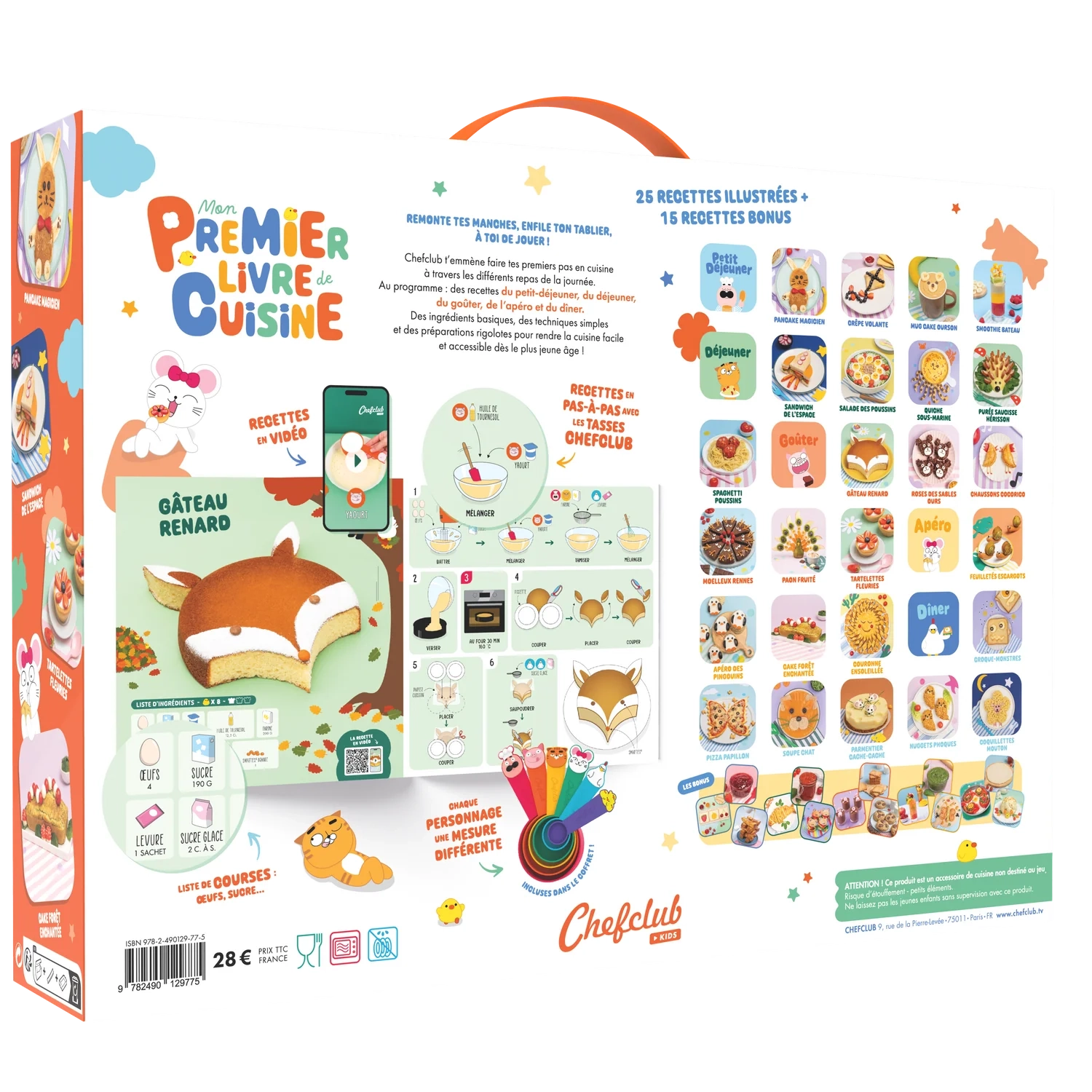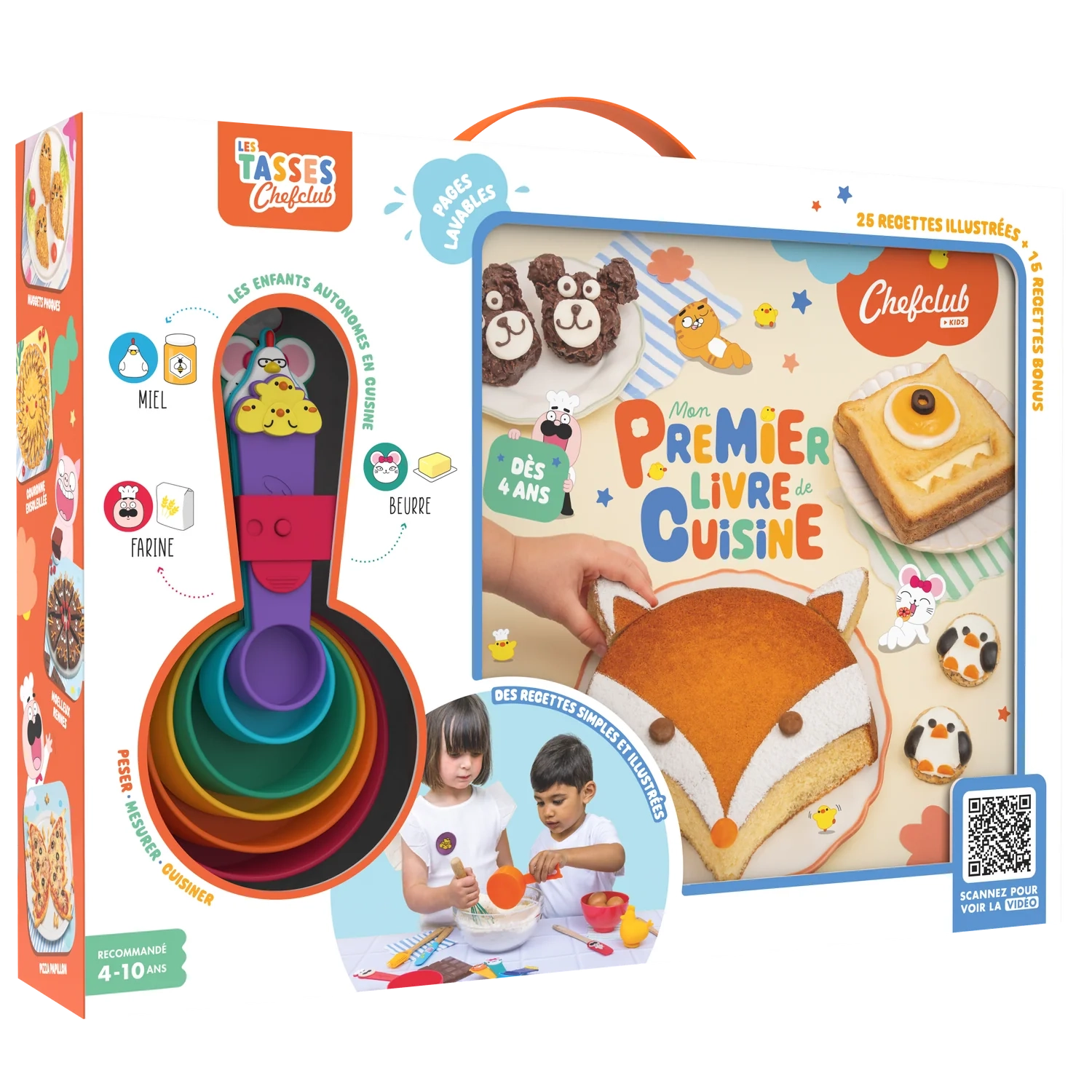 Initiez vos enfants à la cuisine avec le coffret "Mon premier livre de cuisine" de Chefclub, comprenant 25 recettes simples, des tasses de mesure ludiques et des pages lavables pour une expérience culinaire amusante et éducative.