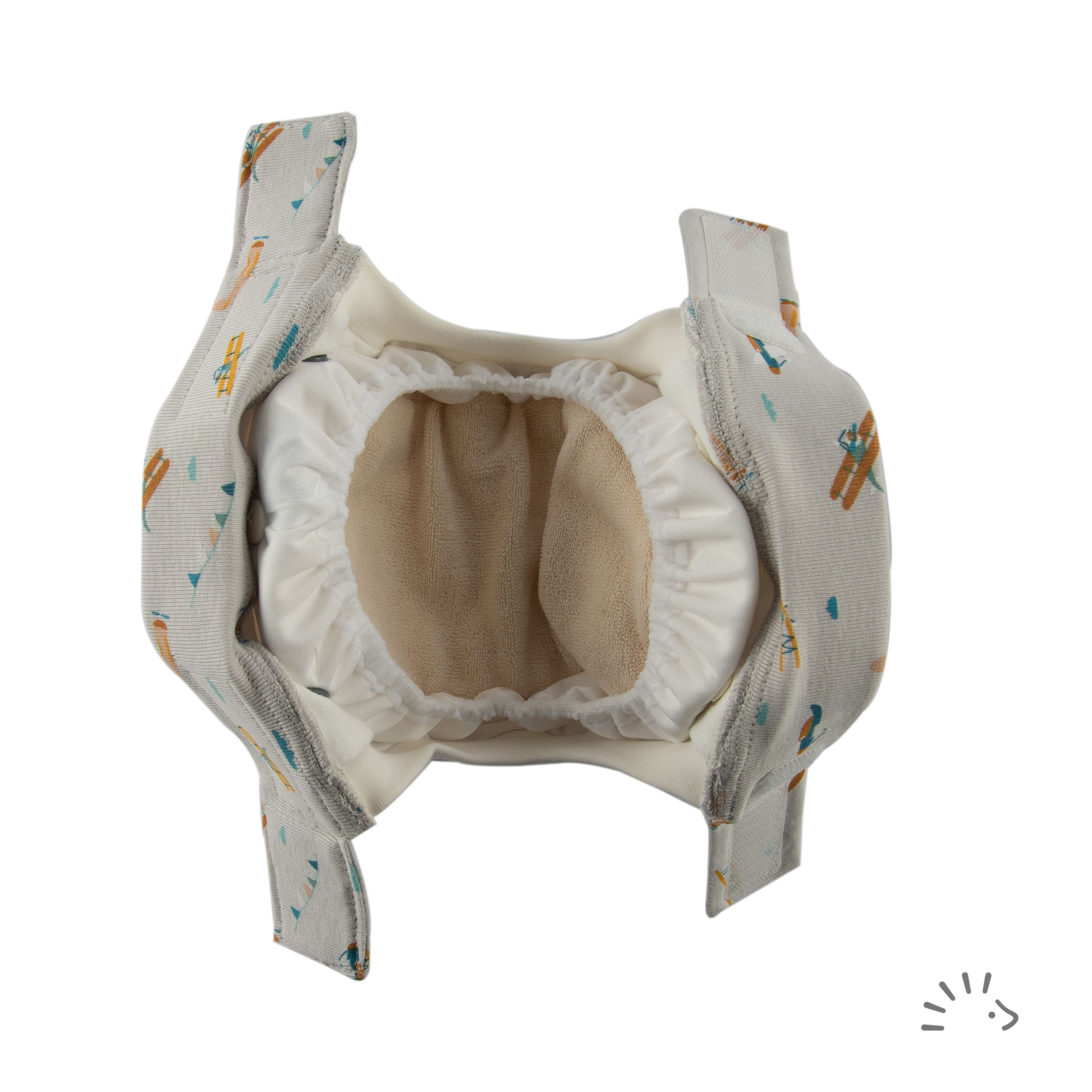 1) Culotte : une culotte en coton avec une bande Velcro (attention, la bande Velcro se ferme de l’avant vers l’arrière). Il fournit la stabilité nécessaire à la couche. Bas de jambe doux pour plus de confort.