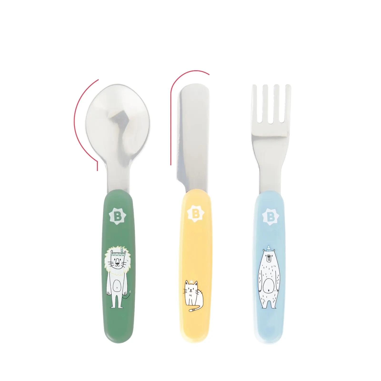 Set de 3 couverts en métal Badabulle pour enfants dès 12 mois : fourchette, couteau et cuillère en acier inoxydable avec angles arrondis et manches de 7 cm adaptés aux petites mains. Motifs colorés de lion, chat et ours. Sans BPA et compatibles lave-vaisselle.