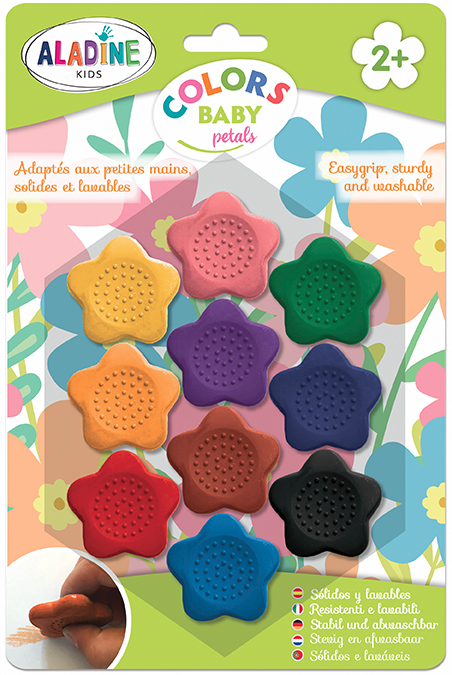 Boite de 10 crayons en formes de pétales faciles à prendre en main par les plus petits. Un côté antidérapant permet de bien le tenir de réaliser ses premiers dessins dès 2 ans.