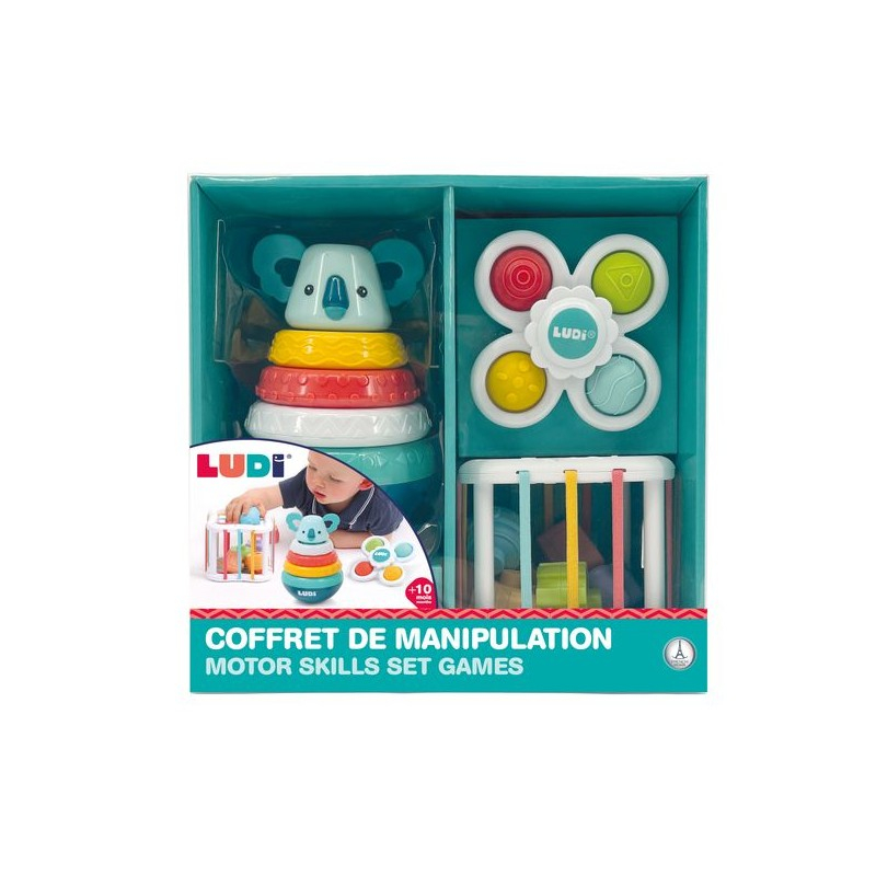 Coffret de jeux avec un cube élastique, une pyramide avec 3 anneaux et 1 baby spinner. Développe la préhension, la logique et la motricité.