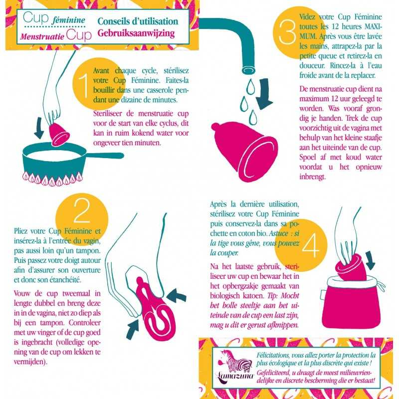 Pliez votre Cup Féminine Lamazuna et insérez-la à l'entrée du vagin. Vous pouvez la laisser en place jusqu'à 12 heures. Ensuite videz-la, rincez-la à l'eau du robinet, puis repositionnez-la. Cette protection est parfaitement invisible. Elle se fait totalement oublier en ne provoquant aucune gêne et en restant en place jusqu'à 12 heures. Imaginez, vous pouvez changer votre protection 2 fois par jour seulement !