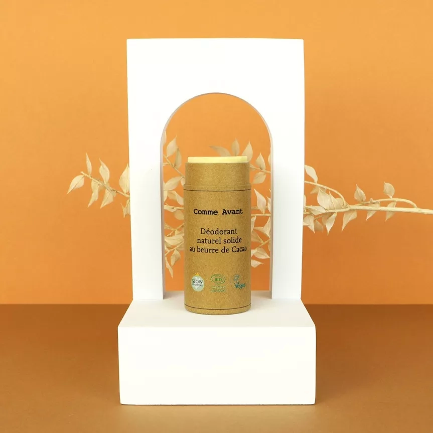 Le déodorant solide au beurre de cacao de Comme Avant offre une protection naturelle et efficace contre la transpiration, tout en respectant les peaux sensibles. Formulé avec des ingrédients 100% d'origine naturelle et certifié COSMOS Organic, il est disponible en plusieurs parfums naturels et est présenté dans un emballage écologique en carton recyclable. Fabriqué artisanalement en France, c'est une alternative responsable aux déodorants industriels.