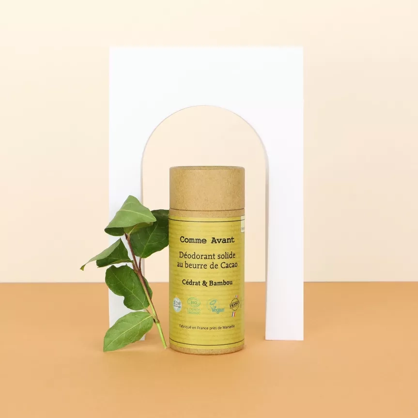 Optez pour le déodorant solide Cédrat & Bambou de Comme Avant : une formule naturelle, efficace et respectueuse de votre peau, avec un parfum frais et un engagement écologique.