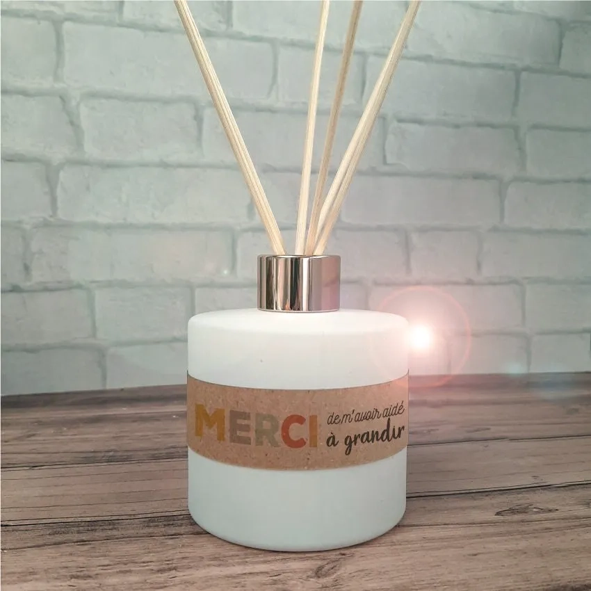 Une idée cadeau pour une maitresse, pour la crèche, une atsem. Un cadeau subtil et doux avec ce message inscrit sur le diffuseur de parfum : 'Merci de m'avoir aidé à grandir'